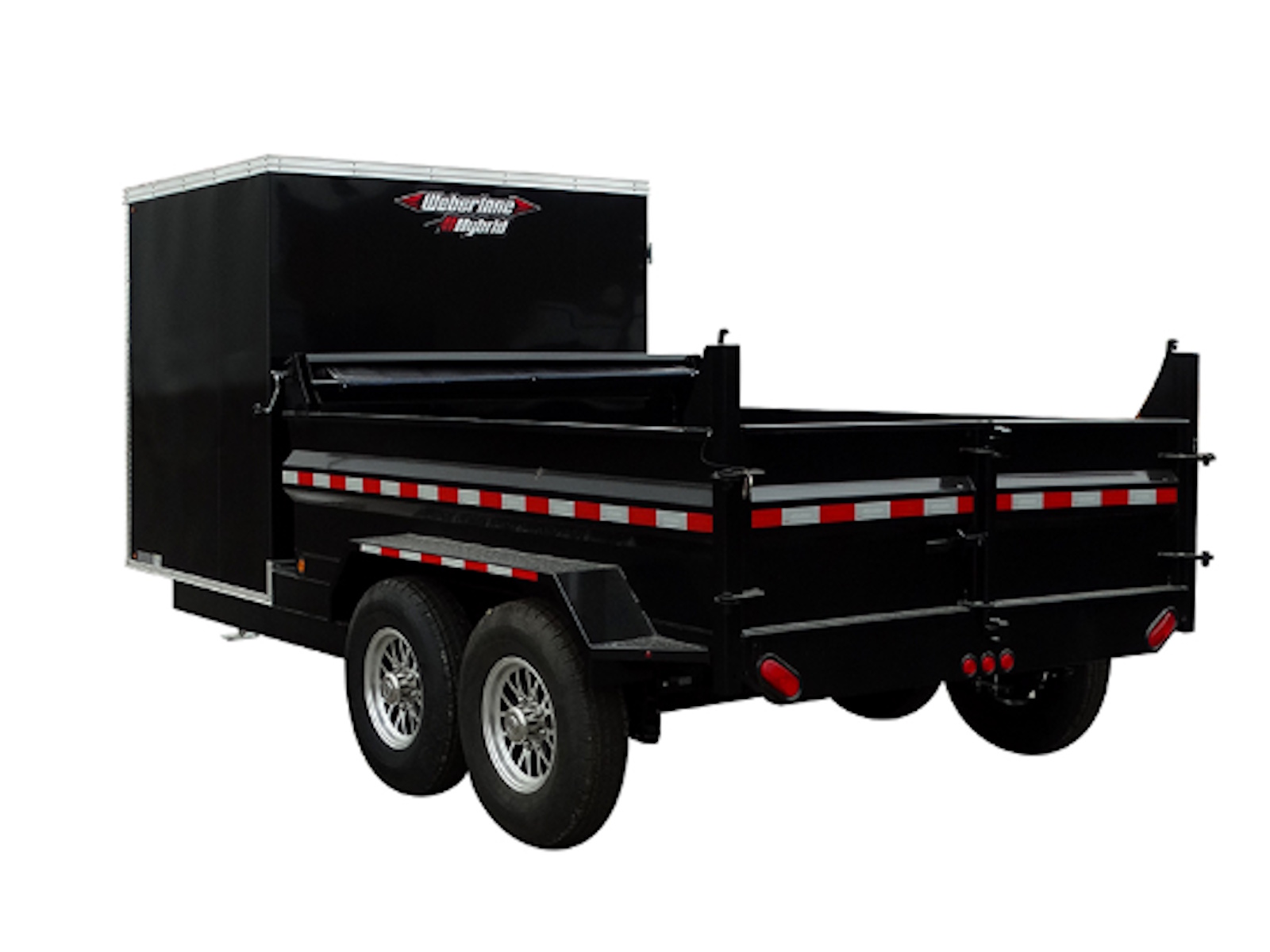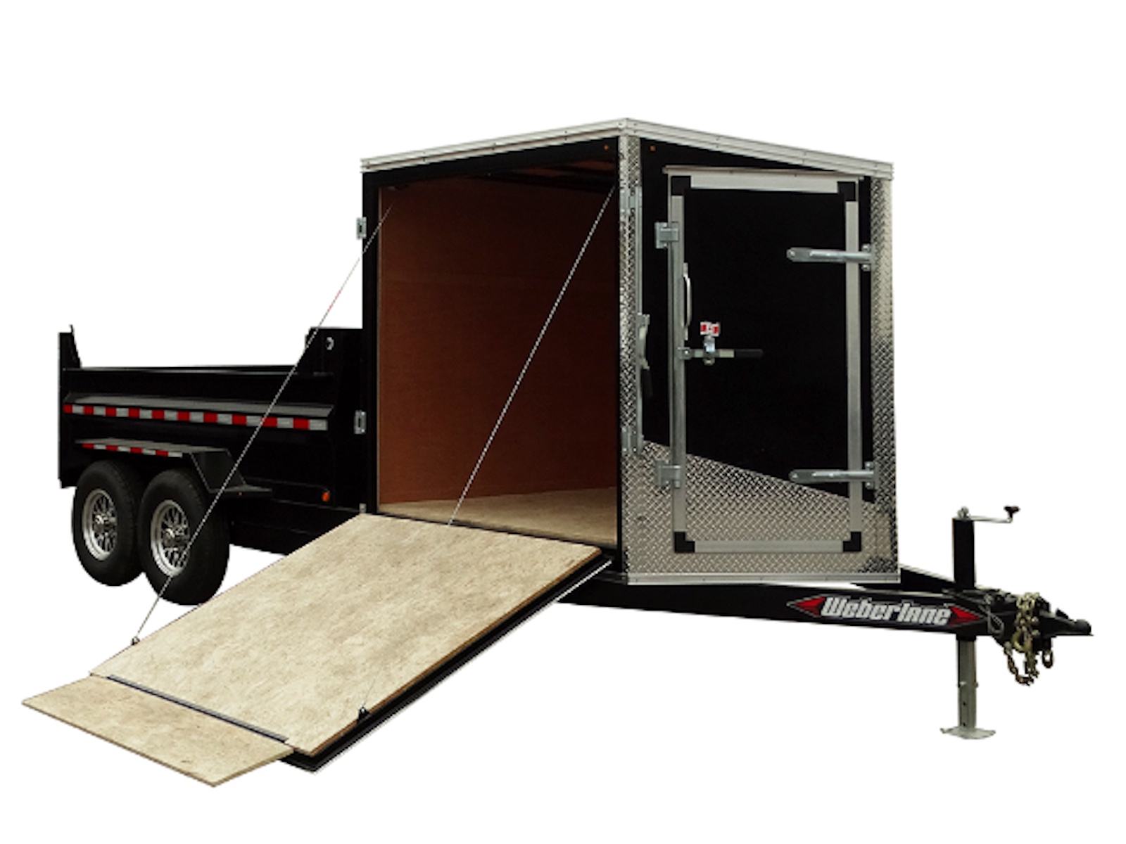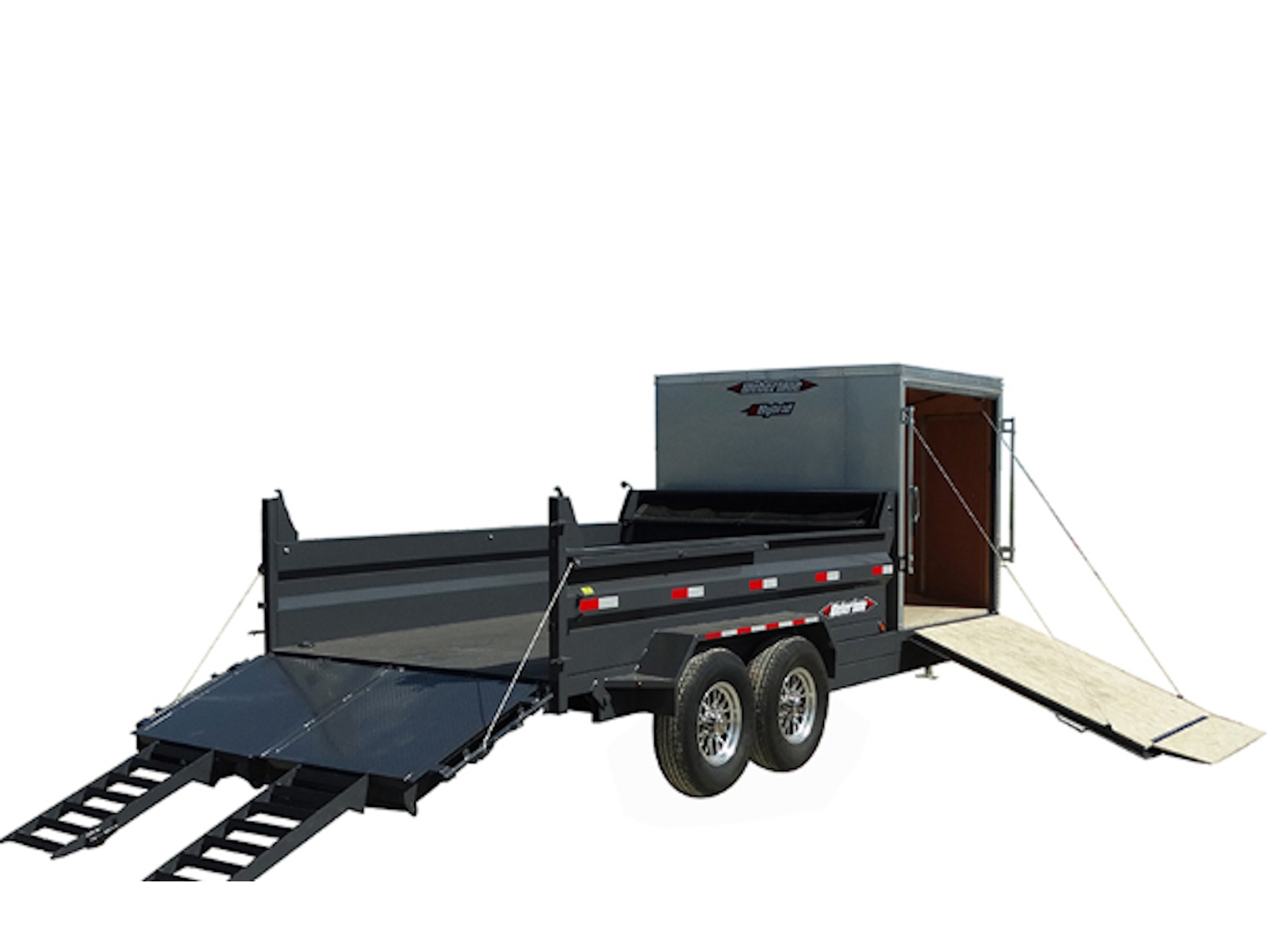 Each trailer is equipped with a shielded roll tarp ensuring secure coverage and lightweight aluminum rims. Perfect for all your transporting needs, our combo trailers combine practicality with quality craftsmanship.