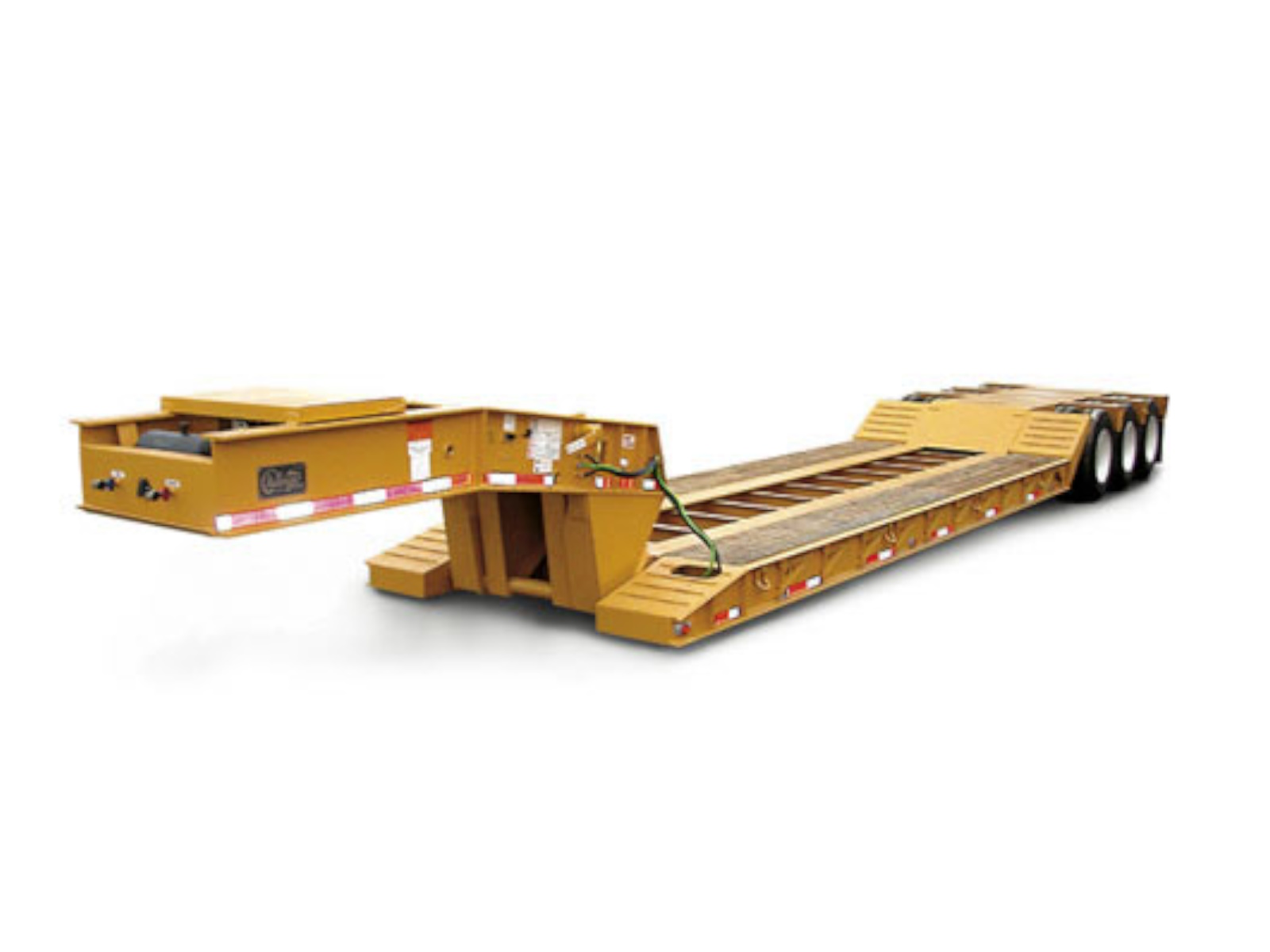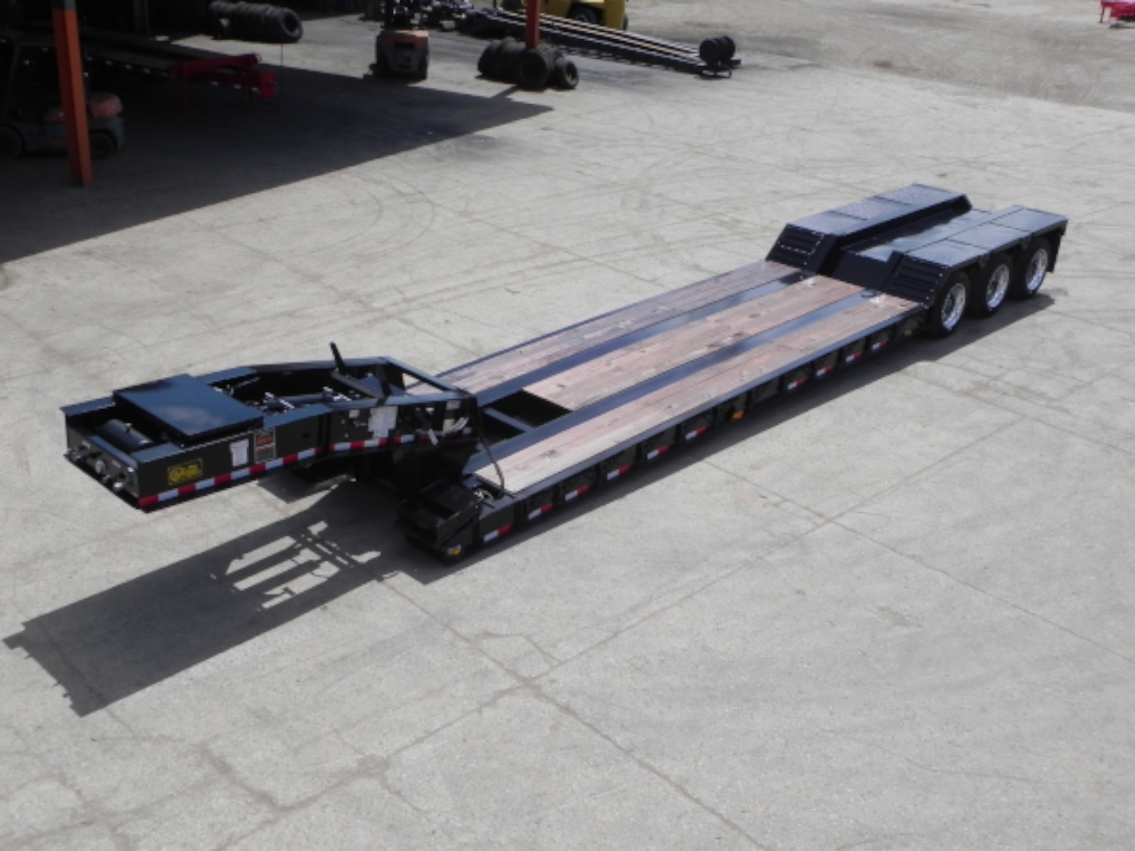 NGB 52 Standard Features – 104,000# load capacity, 3 axles with 48’ overall length. Non ground bearing removable gooseneck with self-contained hydraulic system. 22’ load deck, tapered front beam, 2” lumber decking & (24) 12” outriggers (12 each side). 3 “D” rings per side of deck & 1 on each front stump at tire area, for a total of 8 “D” rings. Hutchen’s type H9700 suspension. 25,000# capacity axles with 16.5” x 7” air brakes, unimount wheels with 255/70 R22.5 Radial tires. Modular wire harness, 12v, DOT approved, rubber-mounted lighting.