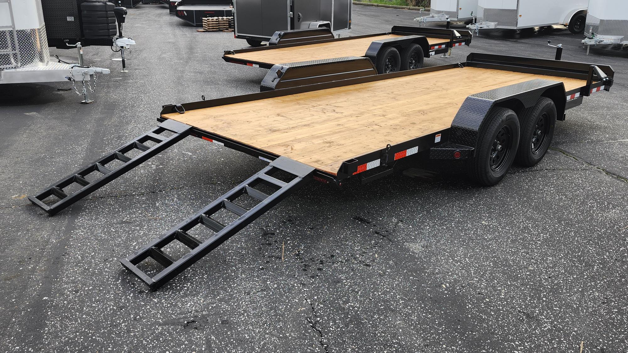 double axle, heavy-duty fenders, front bumper bar, stake pockets, d-rings, stow-away ramps,