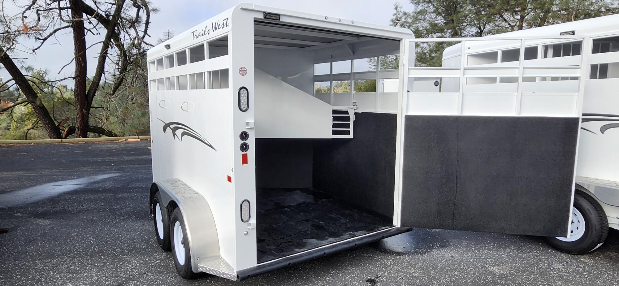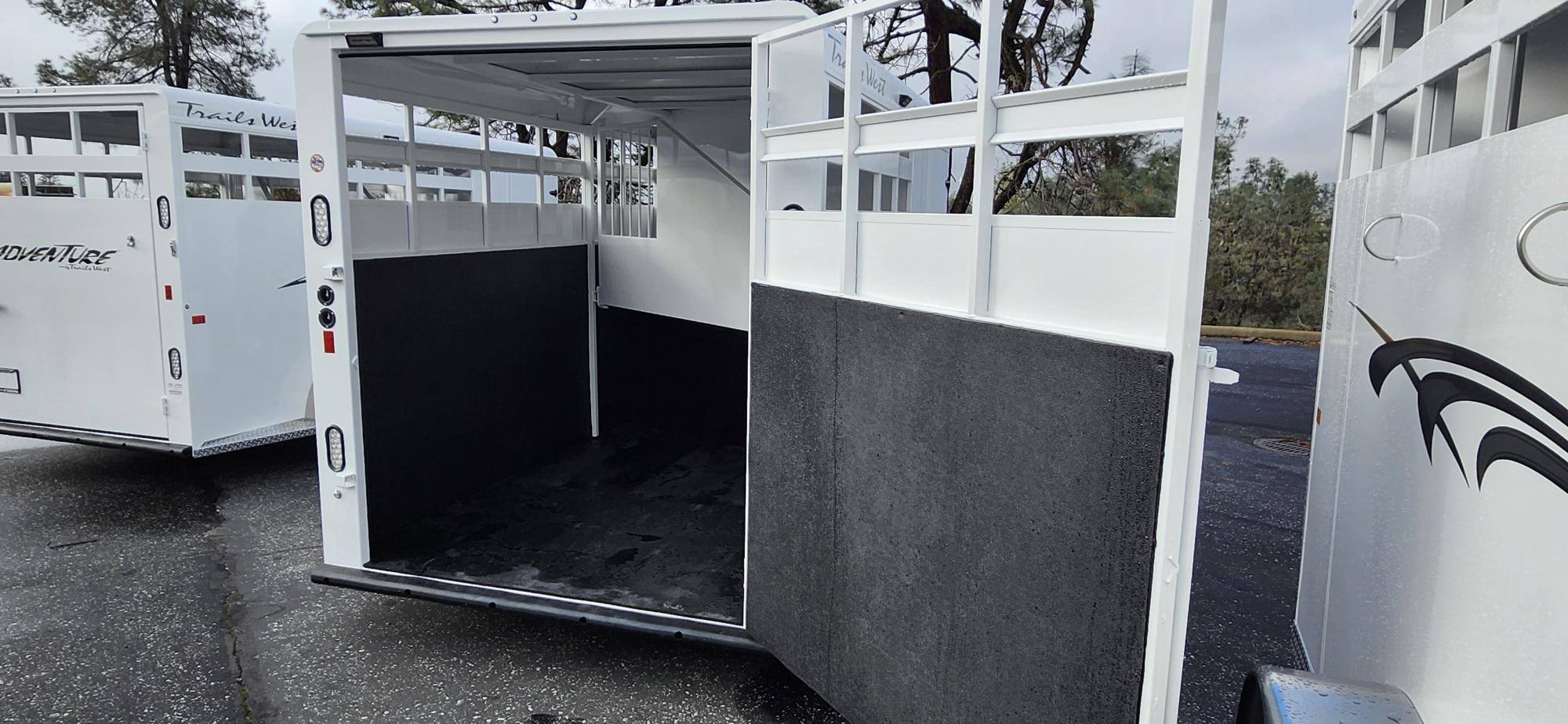 The Adventure is Trailswests most economical horse trailer and is loaded with standard features, making it one of the best values in the industry. This trailer features double air gaps on head and tail side and measures 6’9″ wide and 7’0″ tall. It comes standard with horse dividers, rubber floor mats and 48″ tall rubber wall mats surrounding the entire horse compartment.