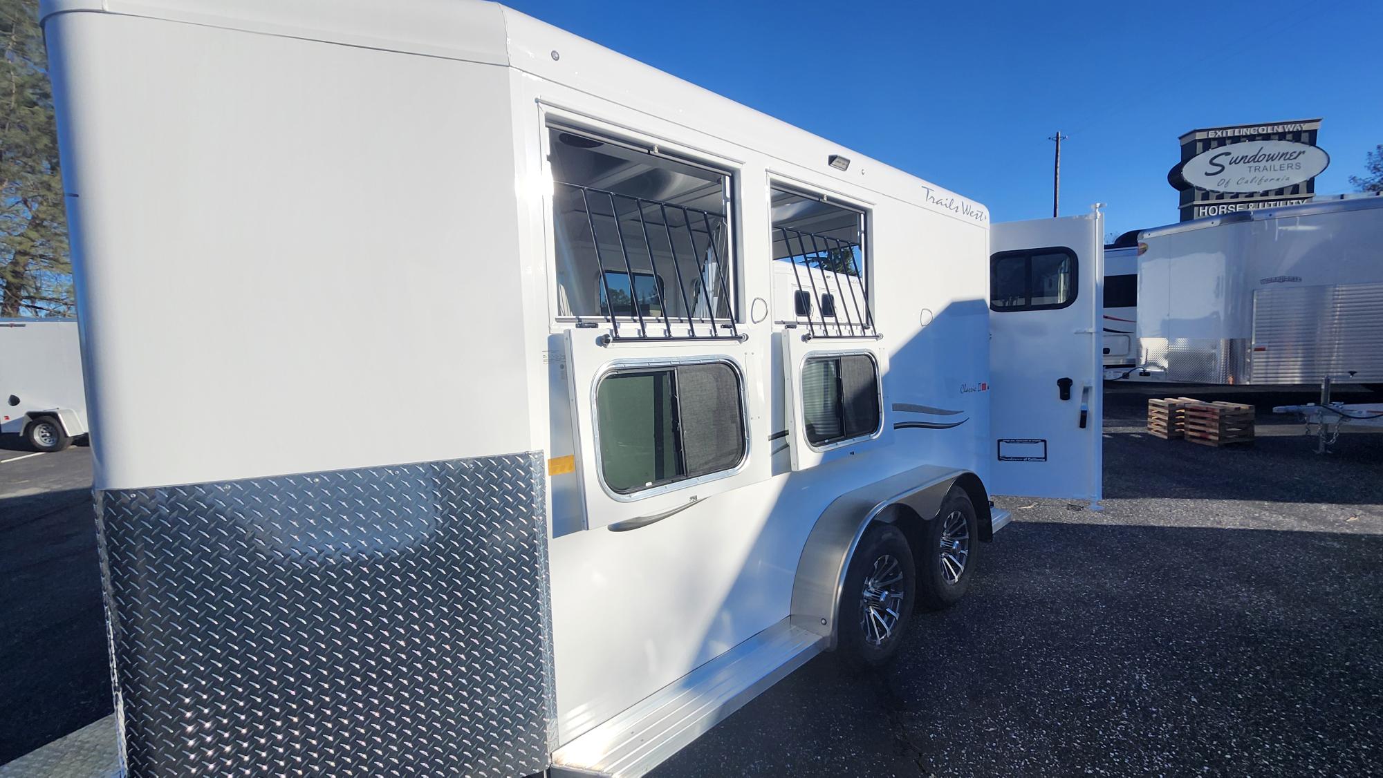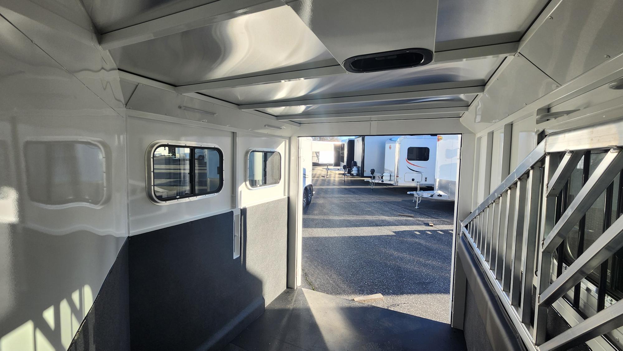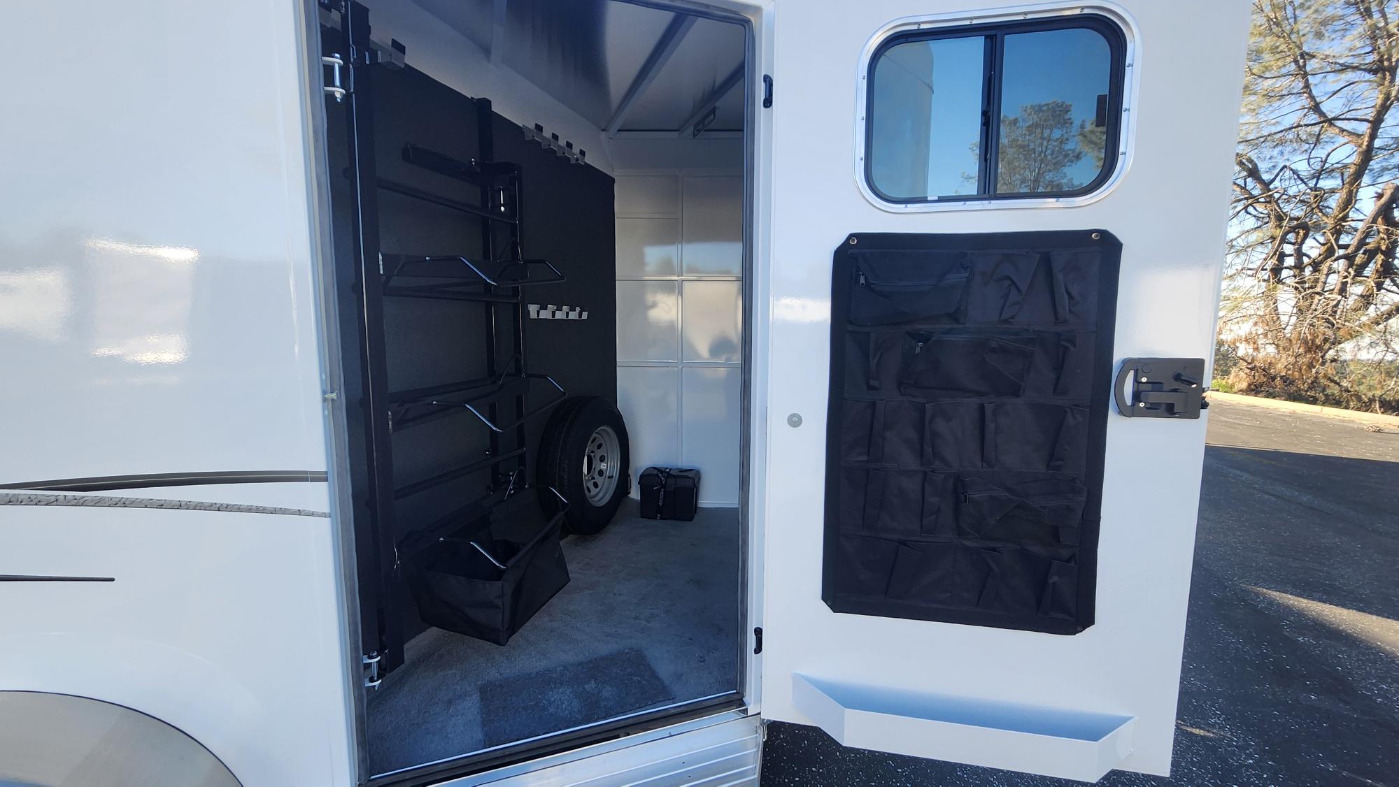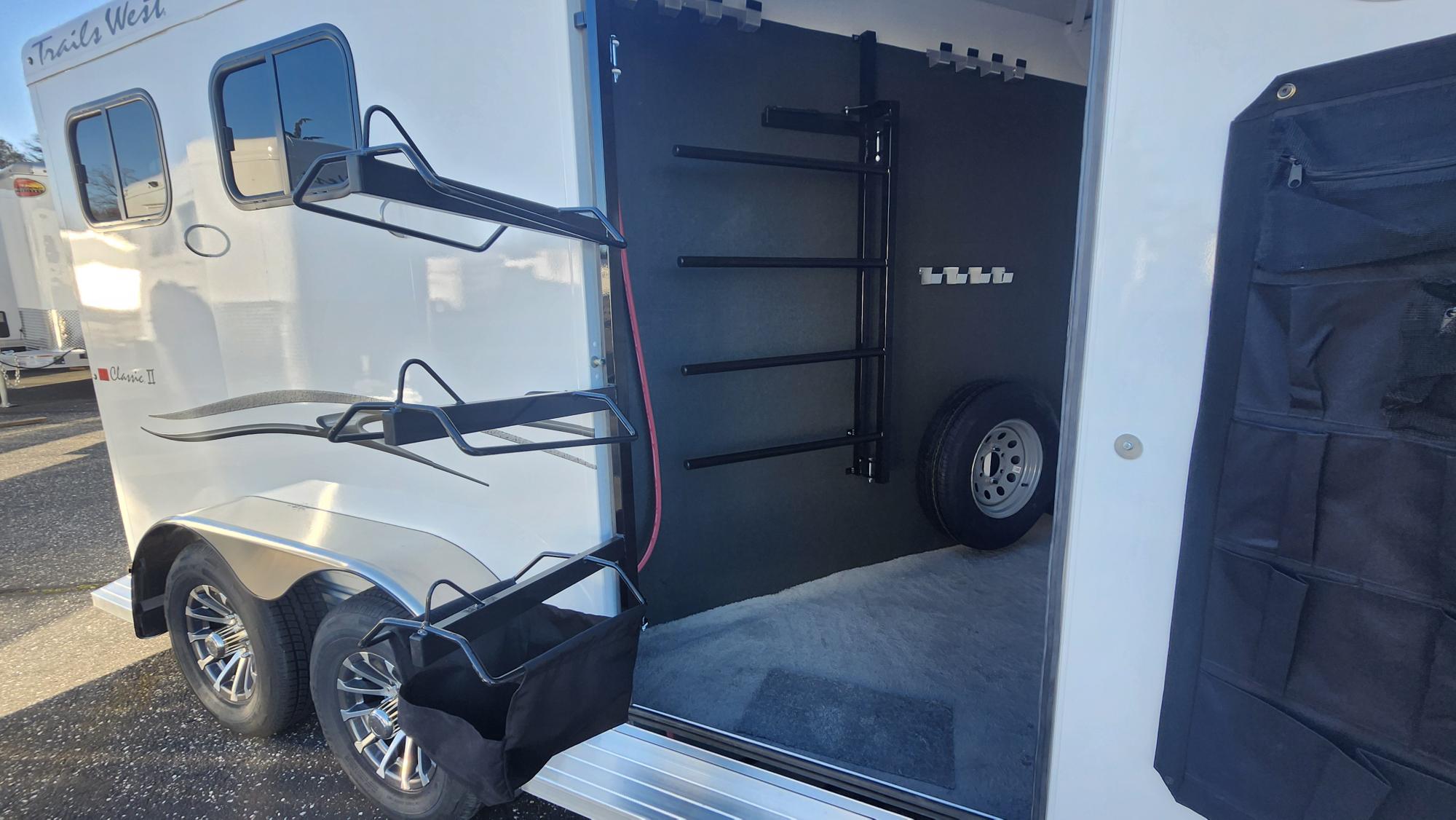 The Classic model is constructed with a steel frame and aluminum skins. It’s 7’0″ wide, and 7’0″ tall and comes standard with custom drop-down feed doors with face grills on the head side, sliding windows on the tail side, and a roof vent in each stall. The large 41″ stalls provide plenty of room and comfort for your horse and feature the industry’s best slam latch divider system. The tack room is roomy and functional and features our state-of-the-art swing-out saddle and blanket racks. This trailer is equipped with the optional Convenience package and windows in rear gate
