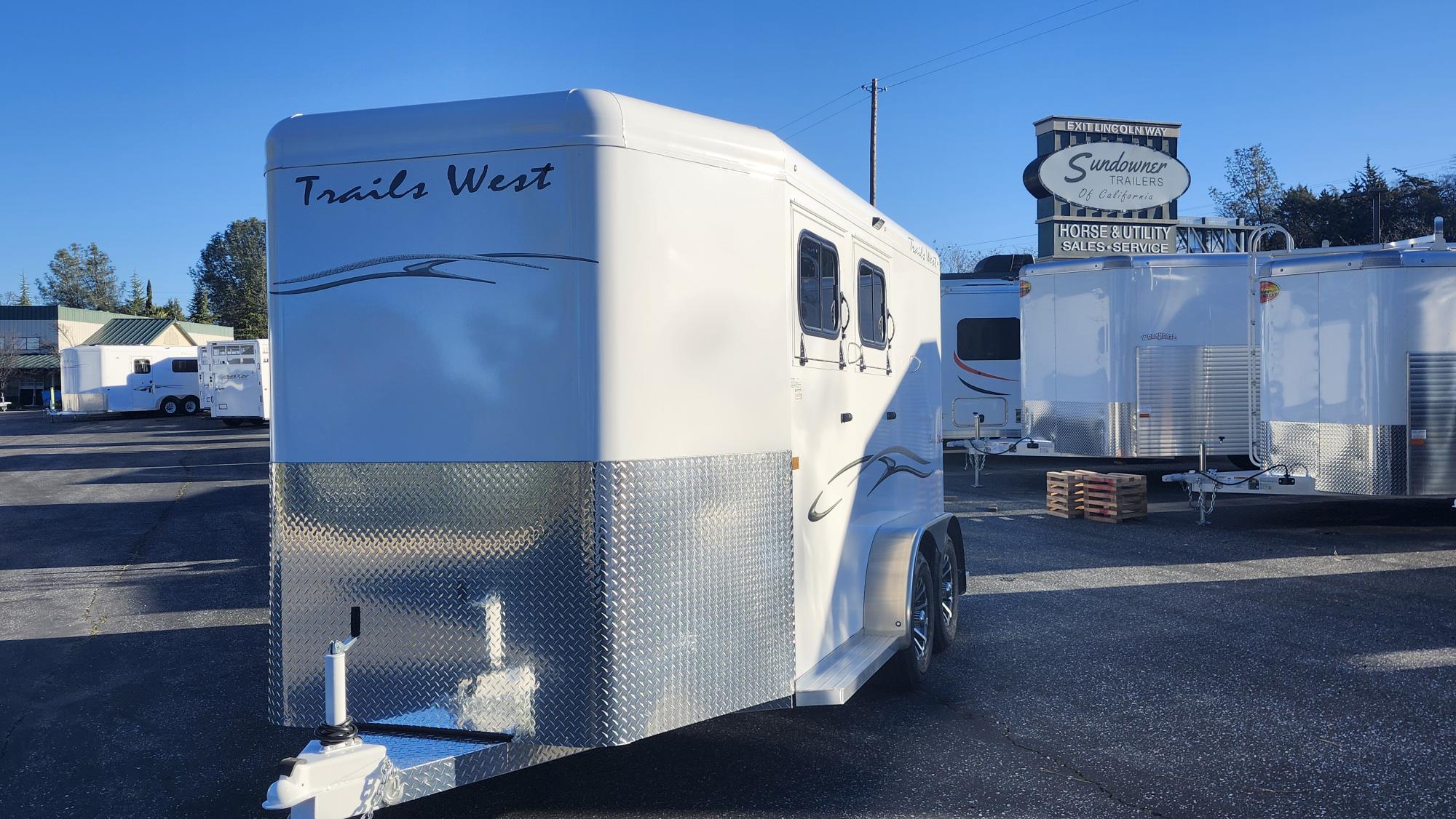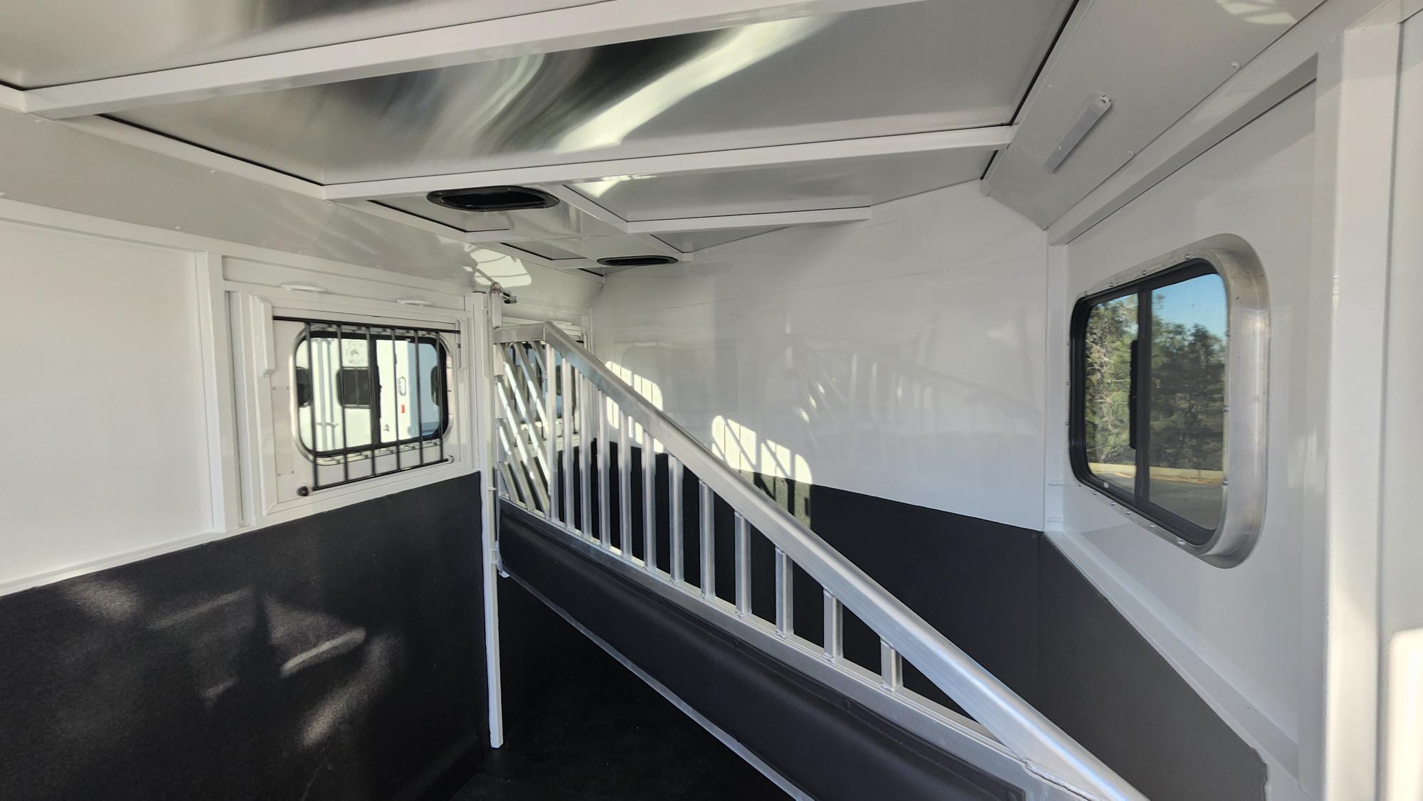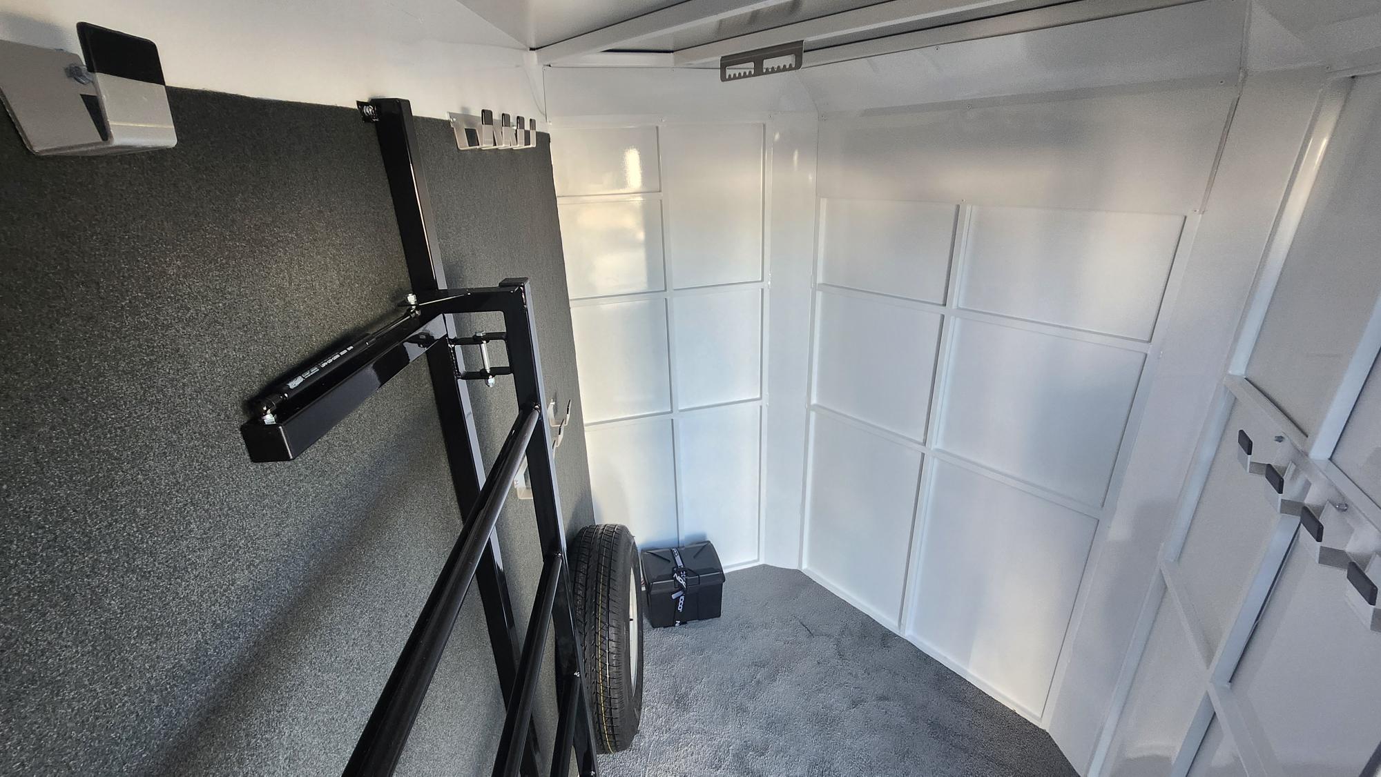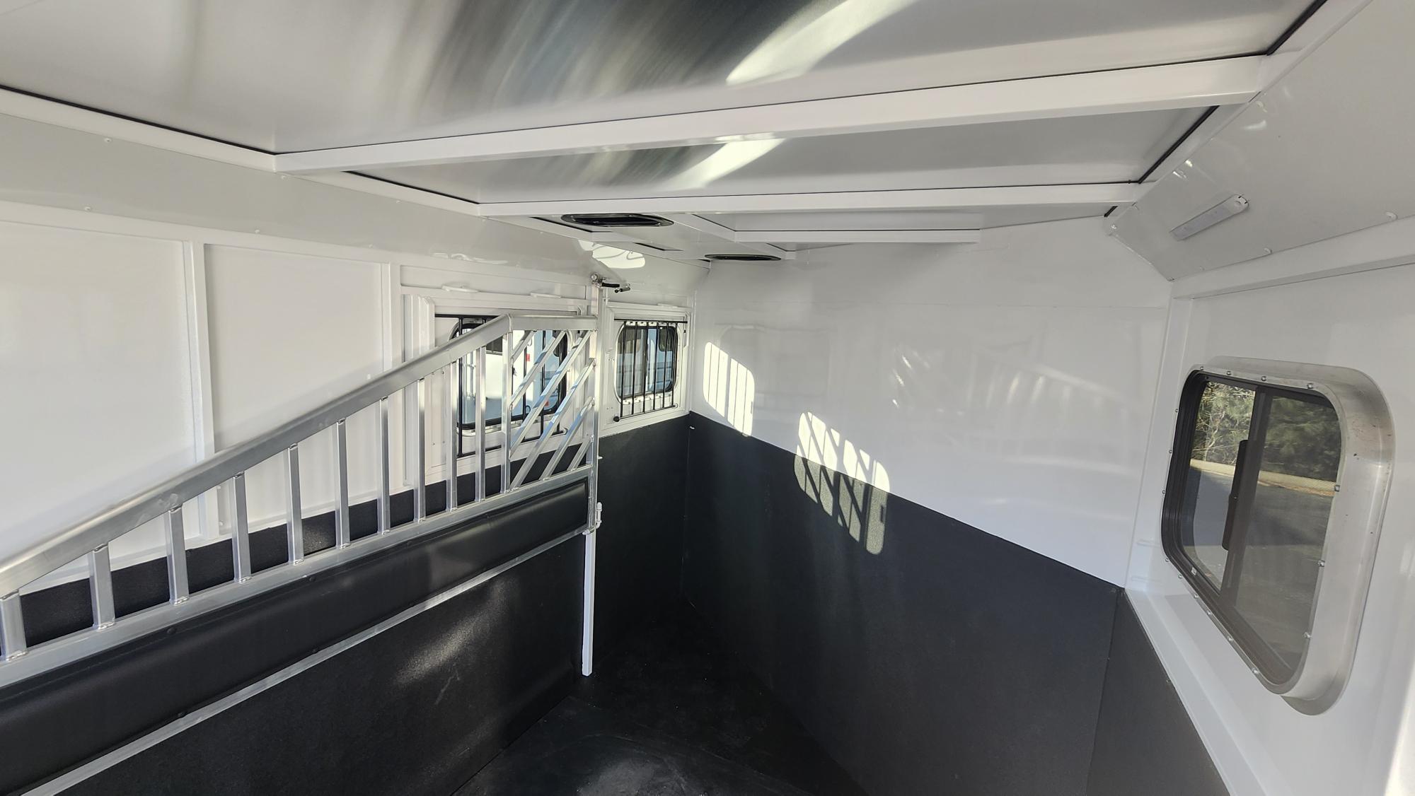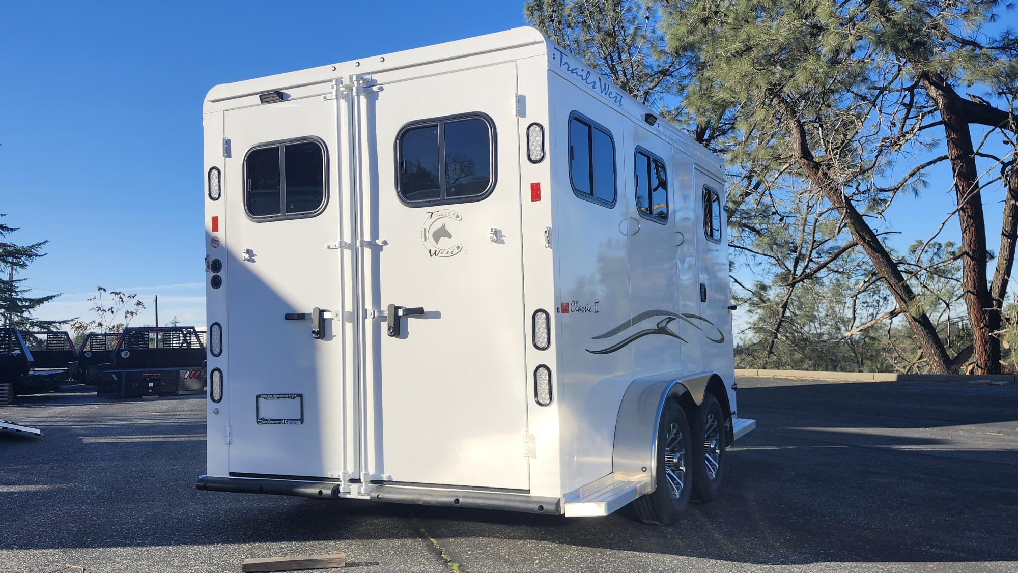 The Classic model is constructed with a steel frame and aluminum skins. It’s 7’0″ wide, and 7’0″ tall and comes standard with custom drop-down feed doors with face grills on the head side, sliding windows on the tail side, and a roof vent in each stall. The large 41″ stalls provide plenty of room and comfort for your horse and feature the industry’s best slam latch divider system. The tack room is roomy and functional and features our state-of-the-art swing-out saddle and blanket racks. This trailer is equipped with the optional Convenience package and windows in rear gate