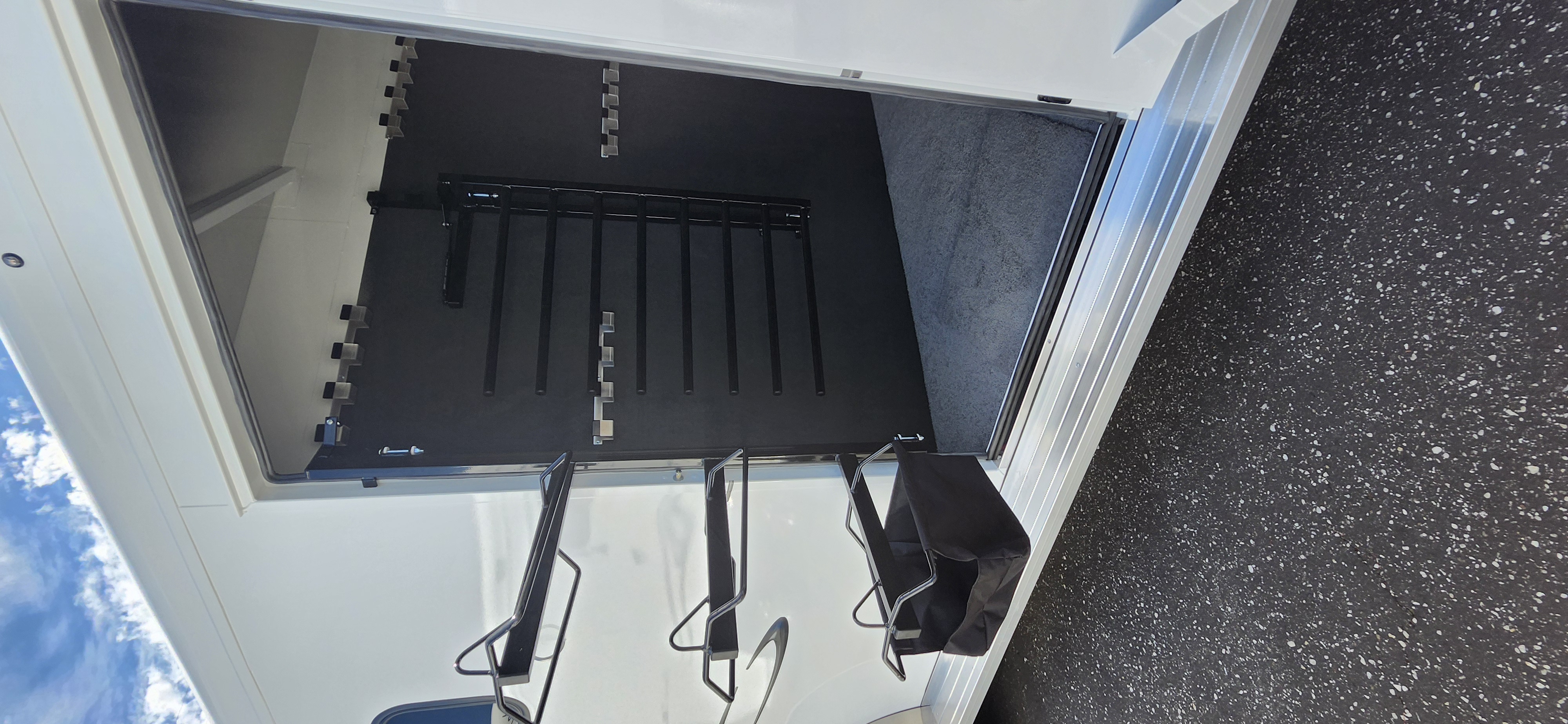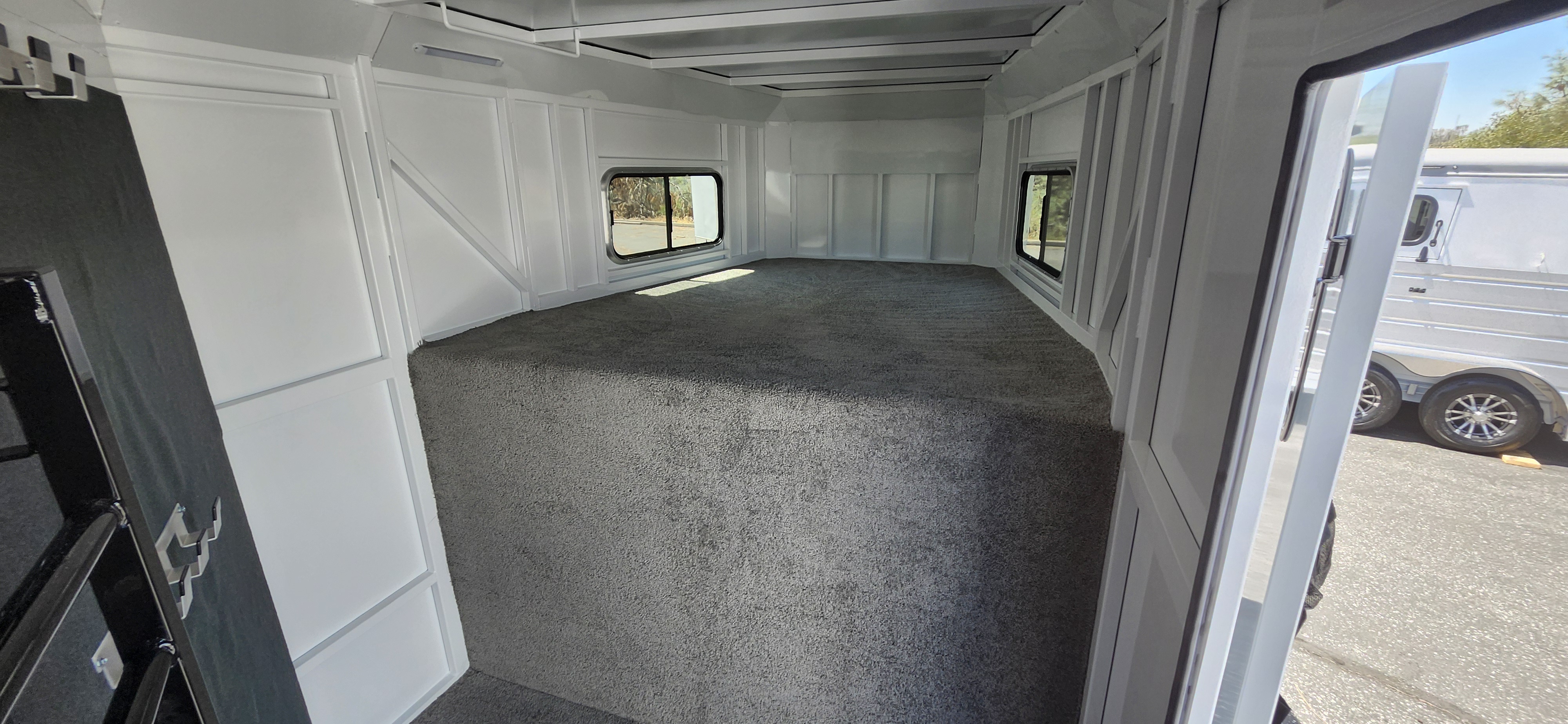 Spare Tire, Water Tank, Door Organizer, 3 Exterior Load Lights, Paneld and insulated dressing room, Locking Battery Box, Hat Racks, Coat Hooks, and A clothes Rod